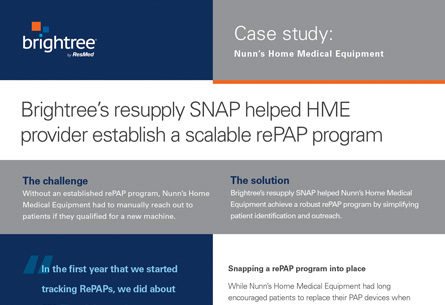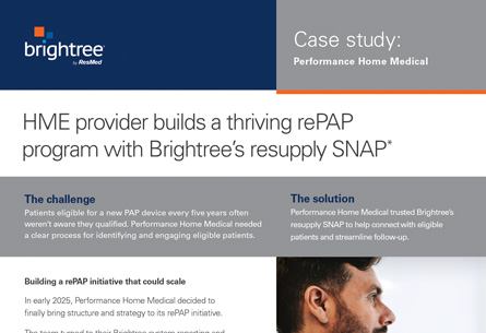 Leading home medical equipment provider Performance Home Medical knew there was untapped potential in rePAP. With Brightree’s resupply SNAP, they connected with eligible patients, streamlined follow-up, and built a sustainable rePAP model for ongoing success. Read the case study to learn how Performance Home Medical reaches up to 20% of their monthly setups from their rePAP initiative.